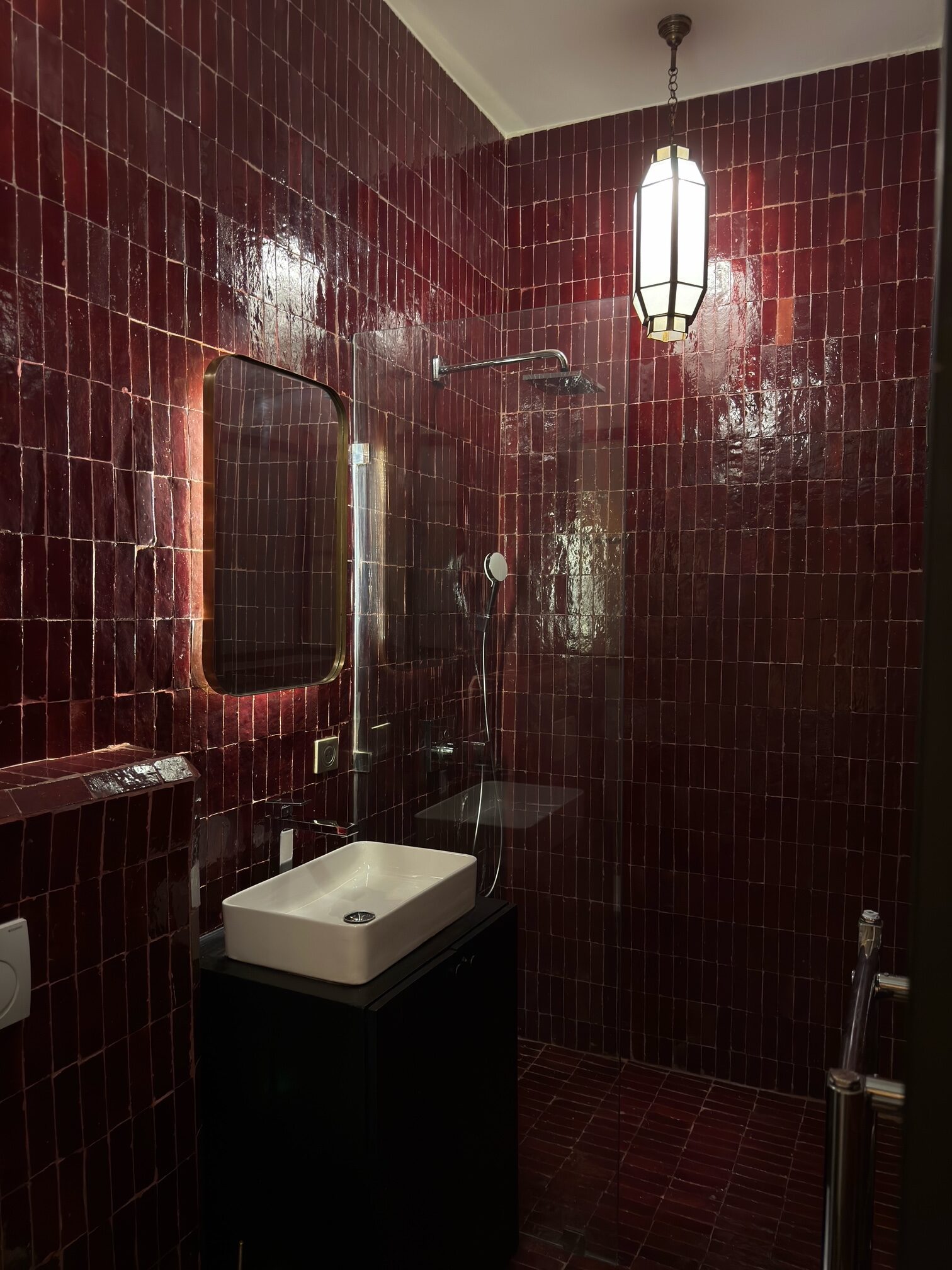 Amra is an intimate cocoon, bathed in a deep burgundy hue that reveals itself in refined touches within the zellige tiles and extends gracefully into the bathroom.
